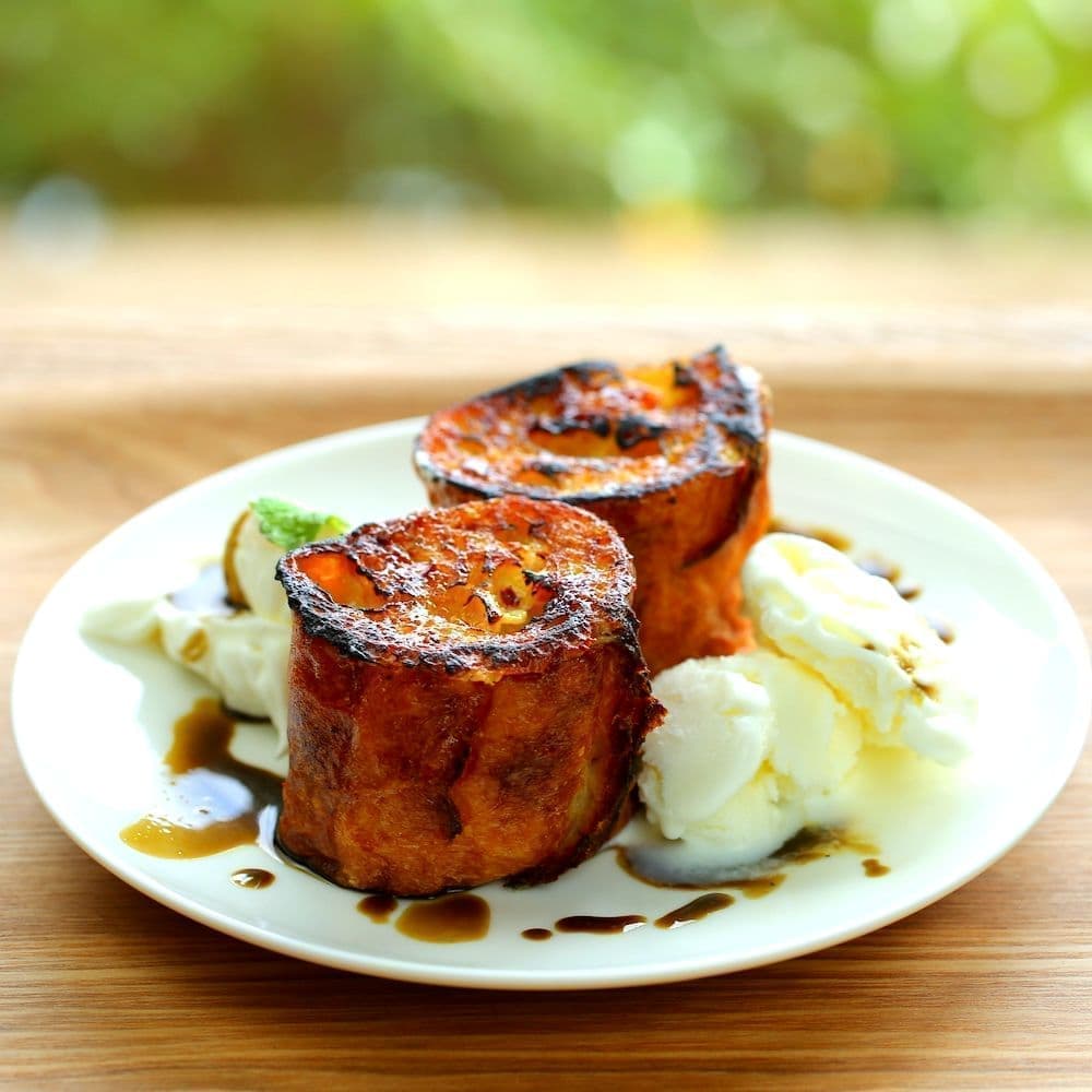 片山津“ヒラクベーカリー”バケットを土田鶏卵の”美味地養卵”、平松牧場の新鮮ミルクにしっかり漬け込み、表面をカリカリに焼き上げました。自家製加賀棒茶シロップで。